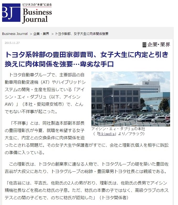 社会 トヨタ系企業 アイシン エィ ダブリュ 幹部の豊田家御曹司 女子大生に内定と引き換えに肉体関係を強要 まとめ初心者