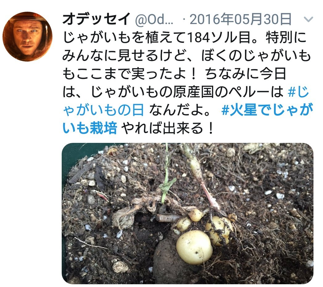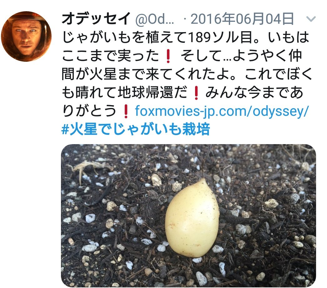 もつれら On Twitter オデッセイは映画も良いんだけど公開にあわせてじゃがいもを四苦八苦しながら育てて上映が終了しても健気に頑張る公式アカウントがすごくあったけぇ気持ちになるんです