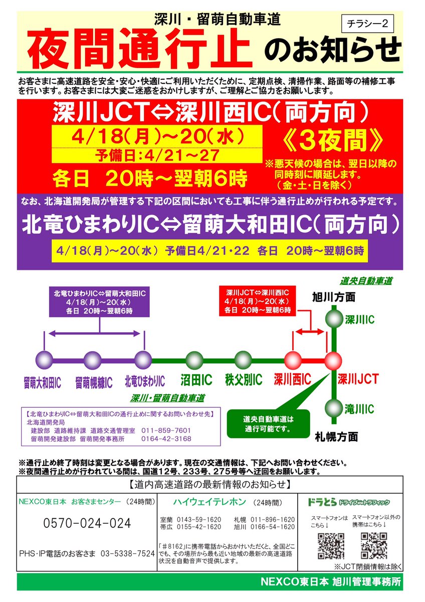 Nexco東日本 北海道 A Twitter 工事夜間通行止 道路維持作業 補修工事のため 4月18日 月 から 道東道 深川留萌道の一部区間で夜間通行止を行います ご迷惑をおかけしますが ご理解ご協力をお願いします Https T Co Egsnp7yrkg Https T Co Cucnscm8uv